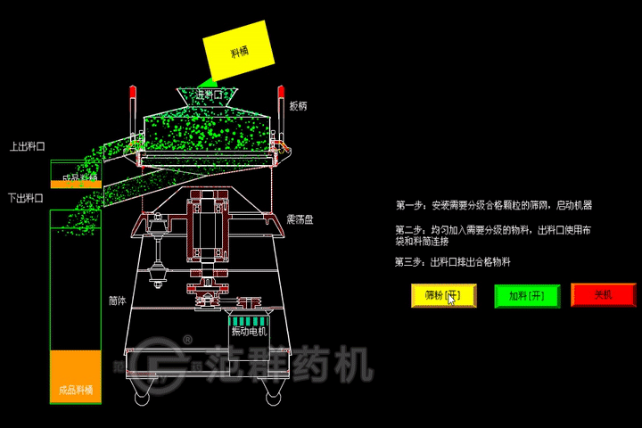 本機由料斗、振蕩室、聯(lián)軸器、電機組成。振蕩室由偏心輪、橡膠軟件、主軸、軸承等組成?烧{節的偏心重錘經(jīng)馬達驅動(dòng)傳達到主軸中心線(xiàn),在不平衡狀態(tài)下,產(chǎn)生離心力,使物料強度改變在篩內形成軌道漩渦。重錘調節器的振幅大小應根據不同物料和篩網(wǎng)進(jìn)行調正。