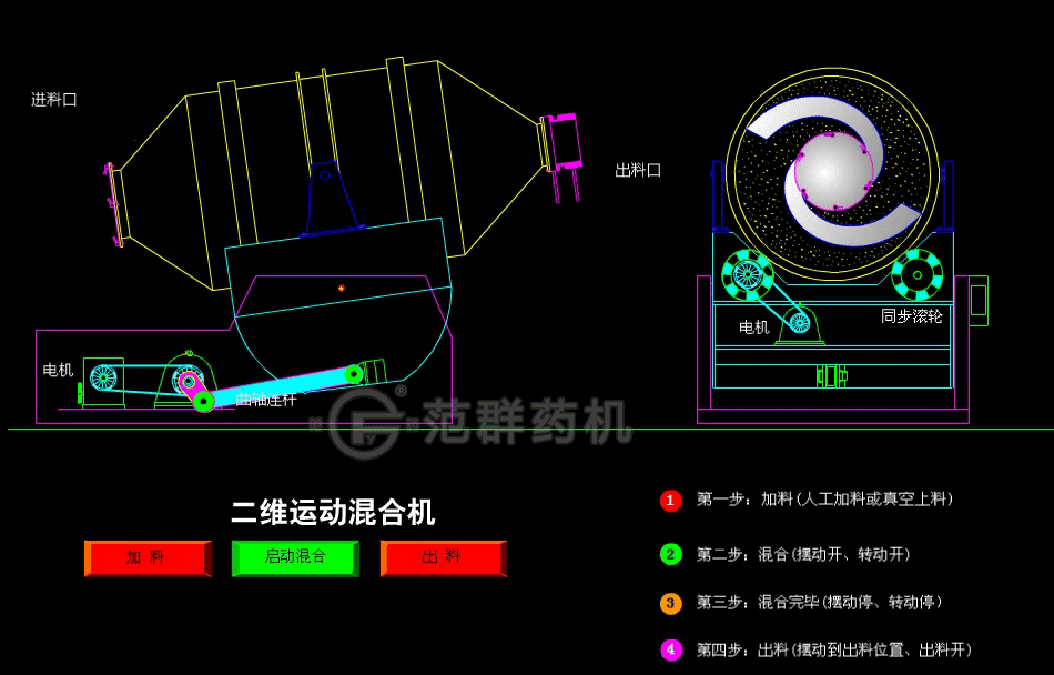 二維混料機主要由轉筒、擺動(dòng)架、機架三大部分構成。轉筒裝在擺動(dòng)架上,由四個(gè)滾輪支撐并由兩個(gè)擋輪對其進(jìn)行軸向定位。在四個(gè)支撐滾輪中,其中兩個(gè)傳動(dòng)輪由轉動(dòng)動(dòng)力系統拖動(dòng)使轉筒產(chǎn)生轉動(dòng),擺動(dòng)架由一組曲柄擺桿機構來(lái)驅動(dòng),曲柄擺桿機構裝在機架上,擺動(dòng)架由軸承組件支撐在機架上。