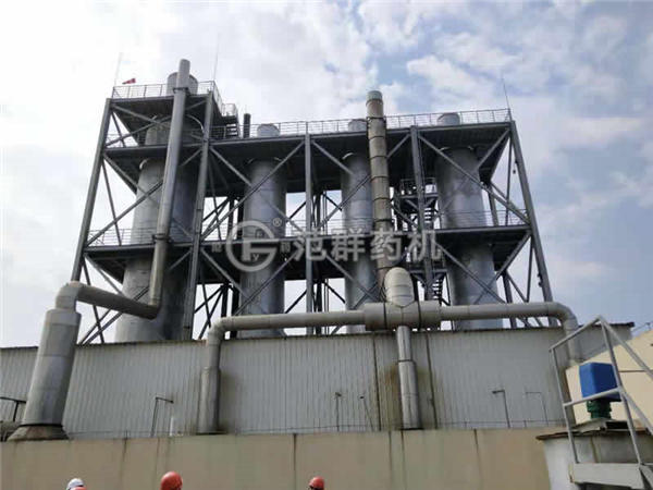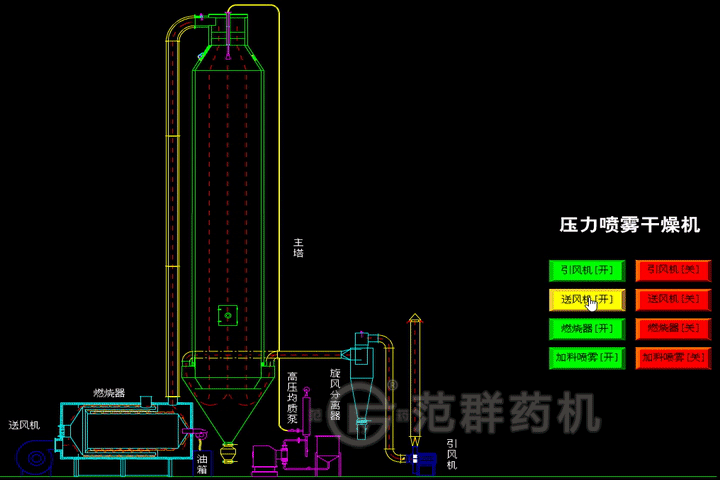 本機組工作過(guò)程為:料液通過(guò)隔膜泵高壓輸入,噴出霧狀液滴,然后同熱空氣并流下降,大部分粉粒由塔底排料口收集,廢氣及其微小粉末經(jīng)旋風(fēng)分離器分離,廢氣由抽風(fēng)機排出,粉末由設在旋風(fēng)分離器下的收粉筒收集,風(fēng)機出口處還可裝備二級除塵裝置,回收率在96%-98%。