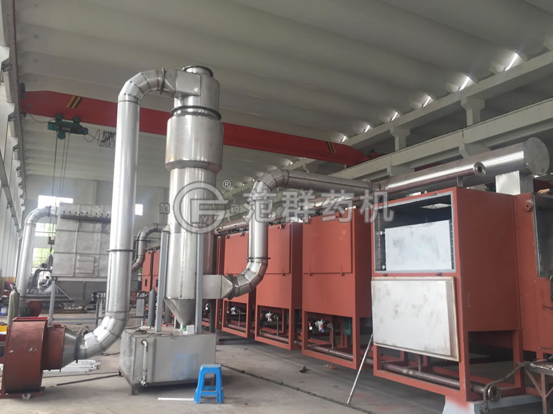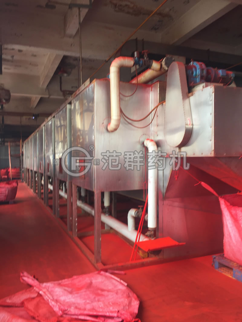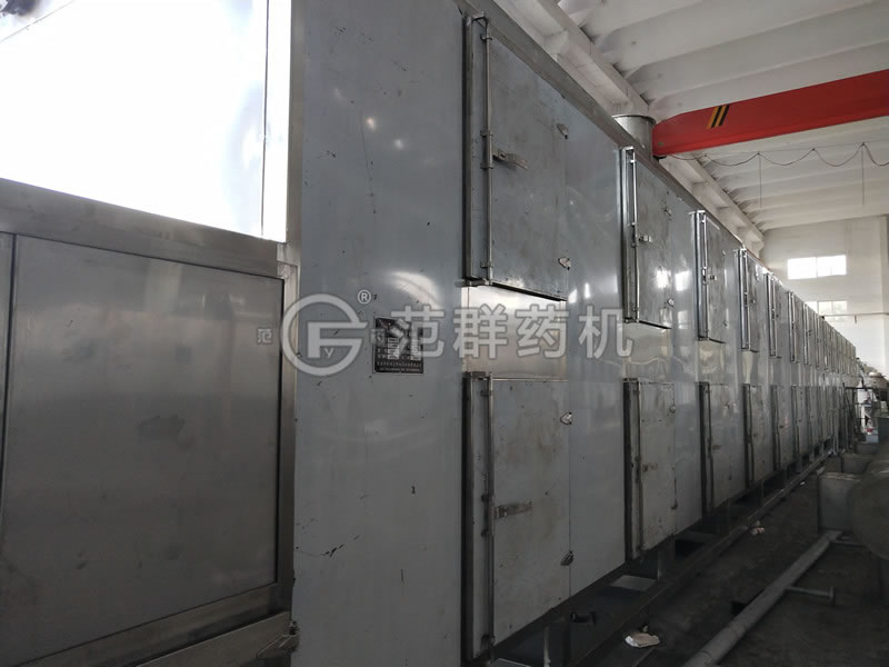 我公司DG型專(zhuān)用穿流帶式干燥機由1、加料器(擠條機)2、下循環(huán)單元,3、上循環(huán)單元,4、網(wǎng)帶,5、傳動(dòng)系統,6、蒸汽加熱系統及冷凝排放系統,7、排濕系統,8、消防系統9、衛生料收集料斗、10、連鎖控制系統等10個(gè)部件組成。